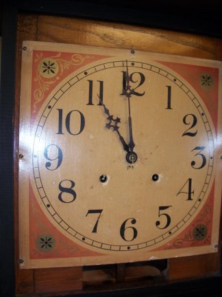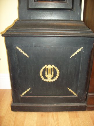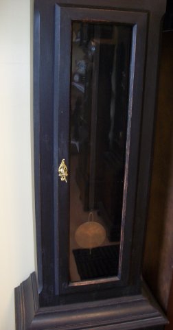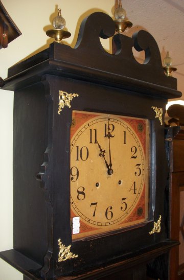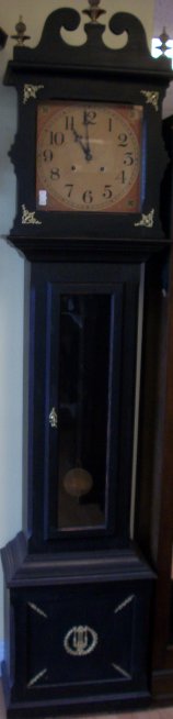 This is an unmarked Grandfather, the works look like a Gilbert Clock Company. The age of the clock is around 1900. It is spring driven with time and strike on a gong. The accents on the clock are all brass. The case is made of oak, but it has been painted long ago with a flat black paint. I don't know if its factory paint or not but the brass pieces really show up nicely on the flat black where as if it were an oak finish the brass would not show up as nice.