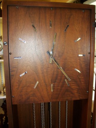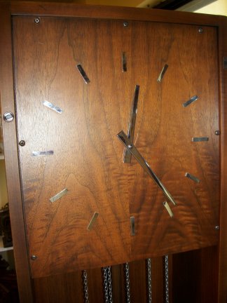Close up of face. The wood seems to be walnut and the chrome numerals stand out