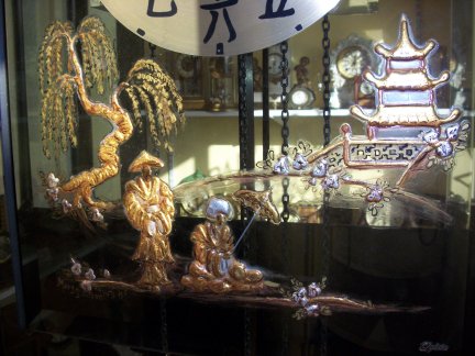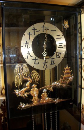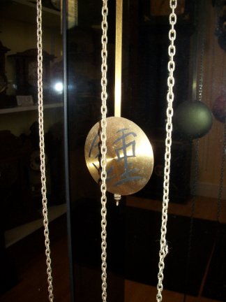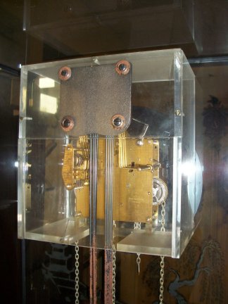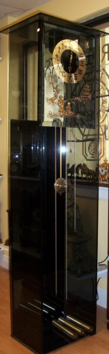 This is a Westminster chime grandmother clock done with an Asian theme. The case is made of Gray smoked glass. It has an 8 day chain driven movement.