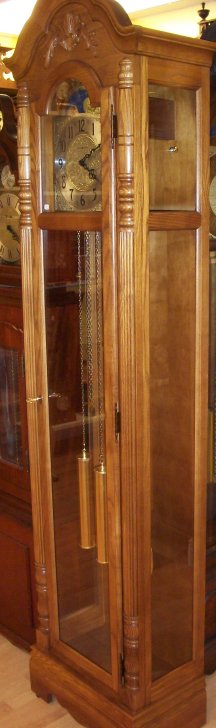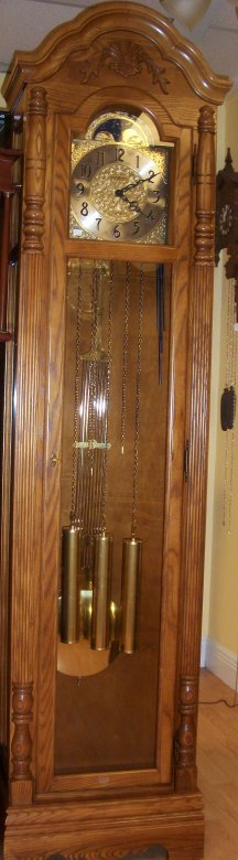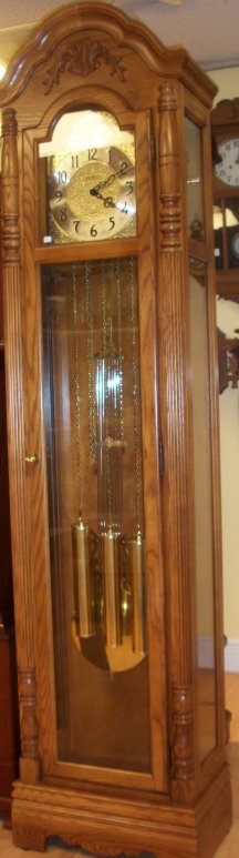This is a Howard Miller oak Grandmother clock standing 78 inches tall.