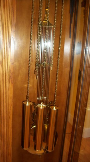 lower portion of the clock, it has a beautiful lyre pendulum.
