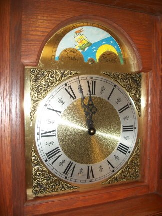 The clock has a beautiful face and has a moving moon dial.