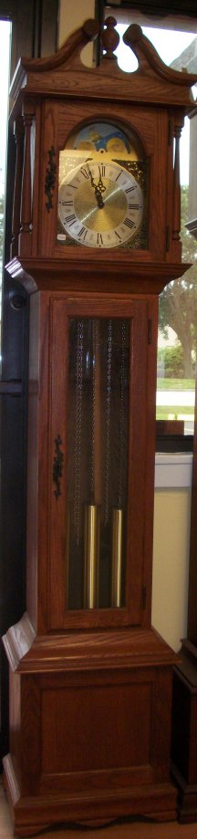 This is a Grandmother clock approximately 76 inches tall. It is made of solid oak with a cherry finish.