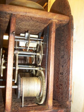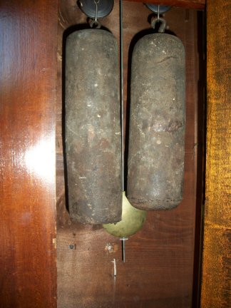 The waist door open showing the old weights and the pendulum.