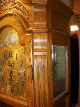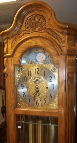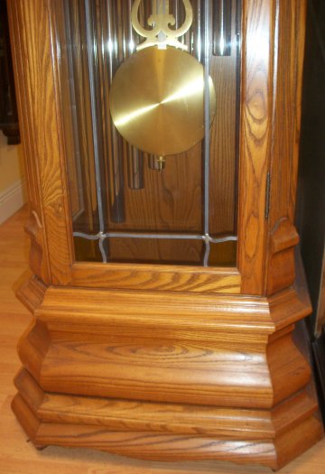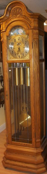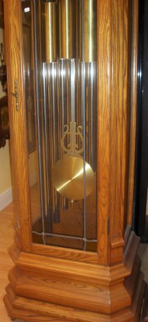 This clock was made by the Herschede clock company of Cincinnati, Ohio. It is a 9 tube ,3 tune grandfather. It stands 86 inches tall,24 inches wide at its widest and has a depth of 16 inches at the deepest. It plays 3 tunes, westminster, whittington, and canterbury. This has an 8 day cable driven works.