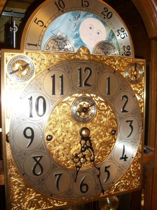 Picture of the ornate face and moon dial with the door open.