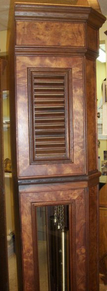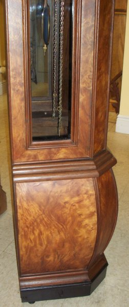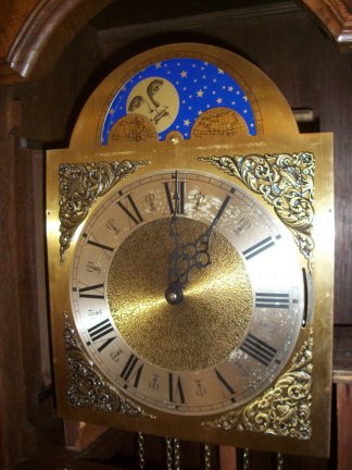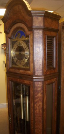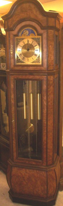 This Grandfather clock was made in Germany of a unknown company. It has a Westminster chime movement and is chain drive. The clock is about 79 inches tall and 21inches wide at the widest.