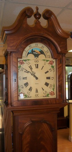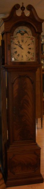 1860 This clock was made by the Seth Thomas Clock Co. It is 89 inches tall and 18.5 inches at its widest. The case is walnut and its style is "Traditional" having a "hood" "waste" and "base" in it's design. The clock has a Westminster chime weight driven chain movement.