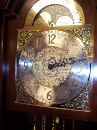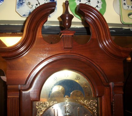 Closer view of the top half of the clock. The wood seems to be walnut.