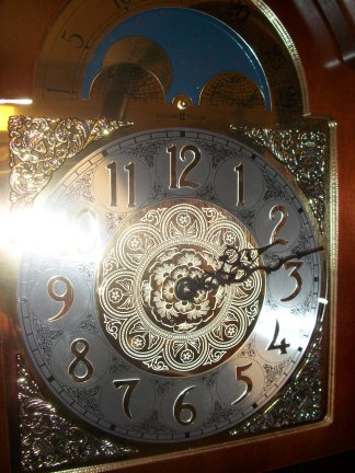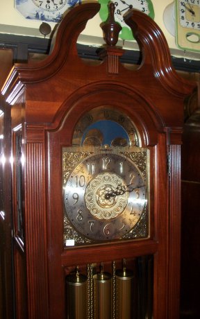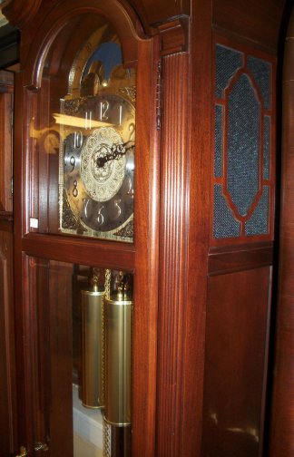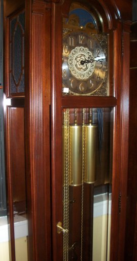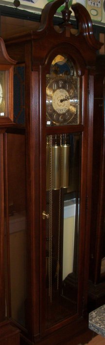 1929 This Grandfather was made by the Howard Miller Clock Co. It is 84 inches tall and is 19 inches wide at the base. The works are an 8 day Westminster chime works with chain drive.
