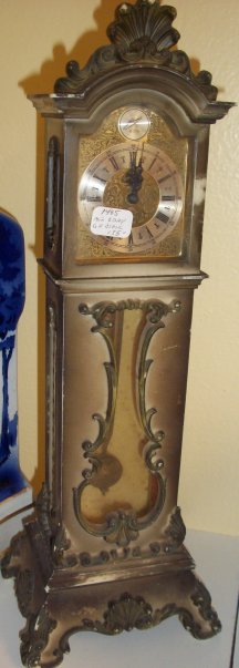 This is an 8 day miniature grandfather clock. Winds in the back and has a pendulum.