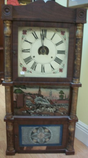 This is called a "Triple Decker" and was made by Birge and Peck and company. It has an 8 day time and strike weight movement.