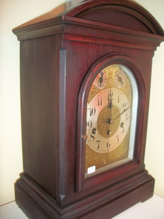 This is a fairly large mantle clock made in Germany, circa 1890's. It has a large westminster chime pendulum movement. The door has beveled glass and the wood seems to be walnut. It has its original weathered finish.